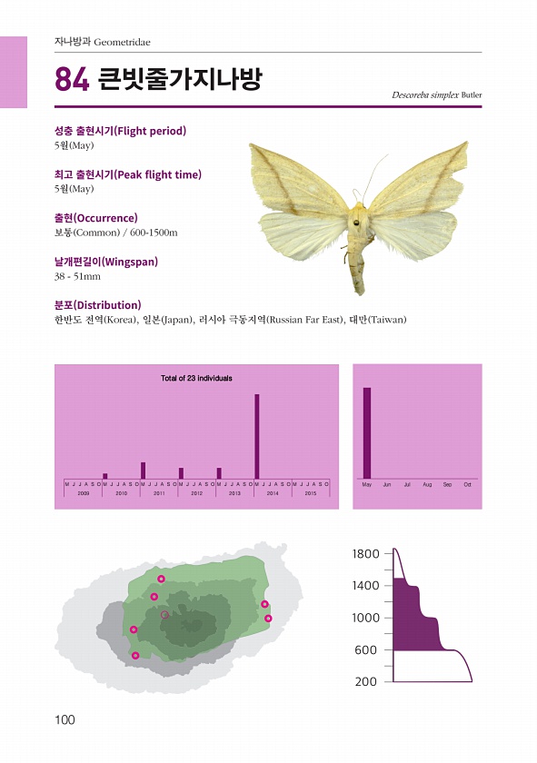 100 자나방과 Geometridae 성충 출현시기 Flight period 5월 May 최고 출현시기 Peak fight time 5월 May 출현 Occurrence 보통 Common 600-1500m 날개편길이 Wingspan 38 51mm 분포 Distribution 한반도 전역 Korea , 일본 Japan , 러시아 극동지역 Russian Far East , 대만 Taiwan Descoreba simplex Butler M J J A S O M J J A S O M J J A S O M J J A S O M J J A S O M J J A S O M J J A S O May Jun Jul Aug Sep Oct 2009 2010 2011 2012 2013 2014 2015 Total of 23 in...