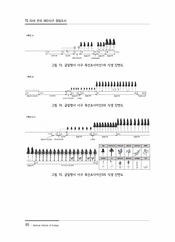 2016 전국 해안사구 정밀조사 88 ? National Institute of Ecology 그림 73. 금일명사 사구 측선조사지선1의 식생 단면도 그림 74. 금일명사 사구 측선조사지선2의 식생 단면도 그림 75. 금일명사 사구 측선조사지선3의 식생단면도