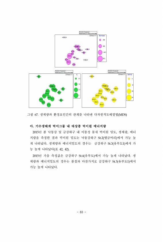 83 그림 67. 생체량과 환경요인간의 관계를 나타낸 다차원척도배열법 MDS 아. 기수생태계 먹이그물 내 대상종 먹이원 에너지량 2015년 봄 낙동강 및 금강하구 내 이동성 물새 먹이원 밀도, 생체량, 에너 지량을 측정한 결과 먹이원 밀도는 낙동강하구 St.2 맹금머리 에서 가능 높 게 나타났다. 생체량과 에너지밀도의 경우는 금강하구 St.3 유부도1 에서 가 능 높게 나타났다 표 42, 42 2015년 가을 측정값은 금강하구 St.4 유부도 에서 가능 높게 나타났다. 생 체량과 에너지밀도의 경우는 봄철과 마찬가지로 금강하구 St.3 유부도1 에서 가능 높게나타났다.