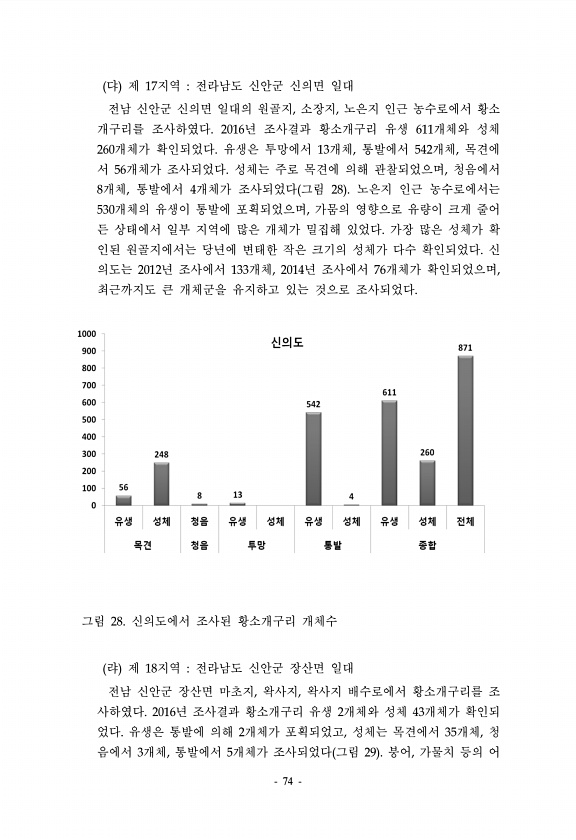 74 댜 제 17지역 전라남도 신안군 신의면 일대 전남 신안군 신의면 일대의 원골지, 소장지, 노은지 인근 농수로에서 황소 개구리를 조사하였다. 2016년 조사결과 황소개구리 유생 611개체와 성체 260개체가 확인되었다. 유생은 투망에서 13개체, 통발에서 542개체, 목견에 서 56개체가 조사되었다. 성체는 주로 목견에 의해 관찰되었으며, 청음에서 8개체, 통발에서 4개체가 조사되었다 그림 28 노은지 인근 농수로에서는 530개체의 유생이 통발에 포획되었으며, 가뭄의 영향으로 유량이 크게 줄어 든 상태에서 일부 지역에 많은 개체가 밀집해 있었다. 가장 많은 성체가 확 인된 원골지에서는 당년에 변태한 작은 크기의 성체가 다수 확인되었다. 신 의도는 2012년 조사에서 133개체, 2014년 조사에서 76개...