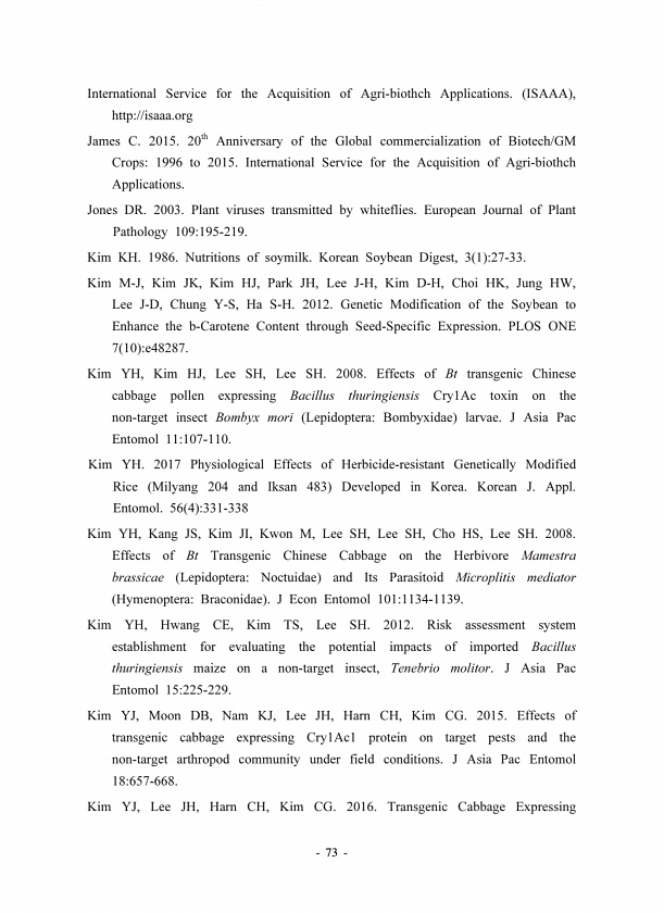 73 International Service for the Acquisition of Agri-biothch Applications. ISAAA , http//isaaa.org James C. 2015. 20th Anniversary of the Global commercialization of Biotech/GM Crops1996 to 2015. International Service for the Acquisition of Agri-biothch Applications. Jones DR. 2003. Plant viruses transmitted by whiteflies. European Journal of Plant Pathology 109195-219. Kim KH. 1986. Nutritions of...