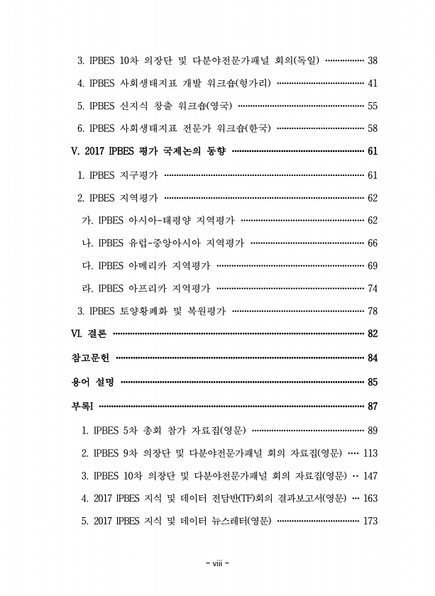 viii 3. IPBES 10차 의장단 및 다분야전문가패널 회의 독일 ················38 4. IPBES 사회생태지표 개발 워크숍 헝가리 ····································41 5. IPBES 신지식 창출 워크숍 영국 ····················································55 6. IPBES 사회생태지표 전문가 워크숍 한국 ····································58 V. 2017 IPBES 평가 국제논의 동향 ······················································61 1. IPBES 지구평가 ····································...