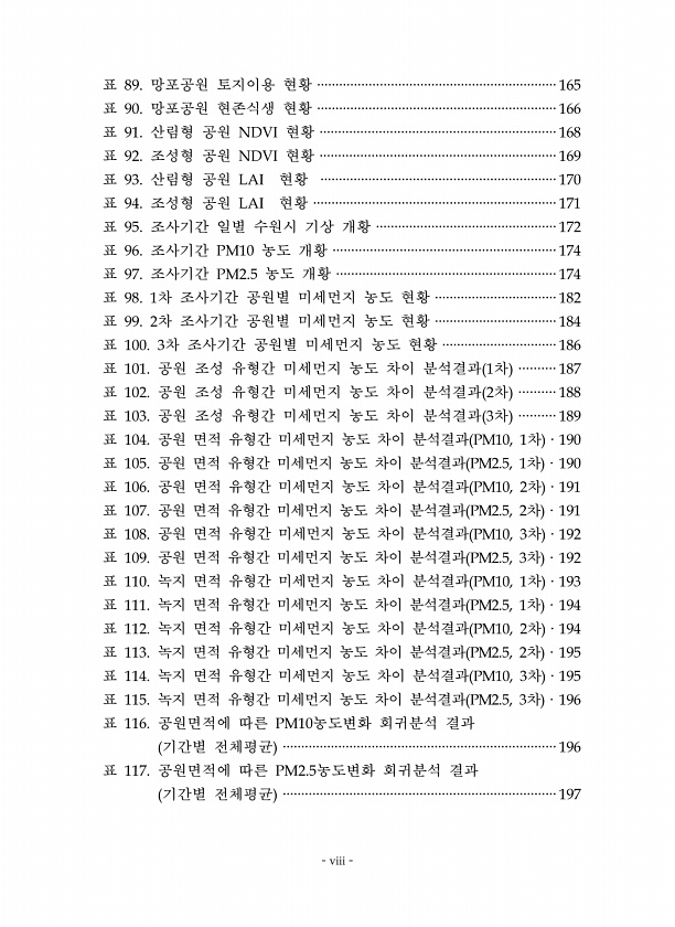 viii 표 망포공원 토지이용 현황 표 망포공원 현존식생 현황 표 산림형 공원 현황 표 조성형 공원 현황 표 산림형 공원 현황 표 조성형 공원 현황 표 조사기간 일별 수원시 기상 개황 표 조사기간 농도 개황 표 조사기간 농도 개황 표 차 조사기간 공원별 미세먼지 농도 현황 표 차 조사기간 공원별 미세먼지 농도 현황 표 차 조사기간 공원별 미세먼지 농도 현황 표 공원 조성 유형간 미세먼지 농도 차이 분석결과 차 표 공원 조성 유형간 미세먼지 농도 차이 분석결과 차 표 공원 조성 유형간 미세먼지 농도 차이 분석결과 차 표 공원 면적 유형간 미세먼지 농도 차이 분석결과 차 표 공원 면적 유형간 미세먼지 농도 차이 분석결과 차 표 공원 면적 유형간 미세먼지 농도 차이 분석결과 차 표 공원 면적 유형간 미세먼지 농도...