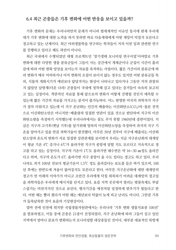 기후변화와 연안생물, 육상동물의 생존전략 99 6.4 최근 곤충들은 기후 변화에 어떤 반응을 보이고 있을까? 기후 변화의 문제는 우리나라만의 문제가 아니라 범세계적인 이슈인 동시에 현재 우리세 대가 기후 변화에 대한 노력을 하지 못하면 바로 다음세대에게 어떤 재앙이 닥칠지 모른다고 경고하고 있는 난제이다. 최근 야외생물학을 연구하는 학자들이 거의 이런 일과 관련한 연구 를 진행하고 있다고 해도 과언이 아니다. 최근 국내에서 수행되었던 대형 프로젝트인 ‘장기생태 모니터링 연구사업’이야말로 기후 변화에 대한 다양한 생물 분류군들이 그들이 사는 공간에서 개체군이나 군집이 시간이 흘러 감에 따라 어떤 변화 양상을 보이는지 자료를 축적하는 사업이다. 짧은 기간이라 분류군에 따 라 변화가 매우 미비하거나 아직 변화의 ...