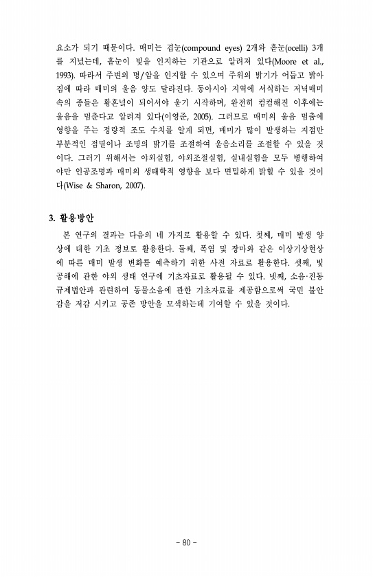 요소가 되기 때문이다. 매미는 겹눈 compound eyes 2개와 홑눈 ocelli 3개 를 지녔는데, 홑눈이 빛을 인지하는 기관으로 알려져 있다 Moore et al., 1993 따라서 주변의 명/암을 인지할 수 있으며 주위의 밝기가 어둡고 밝아 짐에 따라 매미의 울음 양도 달라진다. 동아시아 지역에 서식하는 저녁매미 속의 종들은 황혼녘이 되어서야 울기 시작하며, 완전히 컴컴해진 이후에는 울음을 멈춘다고 알려져 있다 이영준, 2005 그러므로 매미의 울음 멈춤에 영향을 주는 정량적 조도 수치를 알게 되면, 매미가 많이 발생하는 지점만 부분적인 점멸이나 조명의 밝기를 조절하여 울음소리를 조절할 수 있을 것 이다. 그러기 위해서는 야외실험, 야외조절실험, 실내실험을 모두 병행하여 야만 인공조명과 매미의 생태...