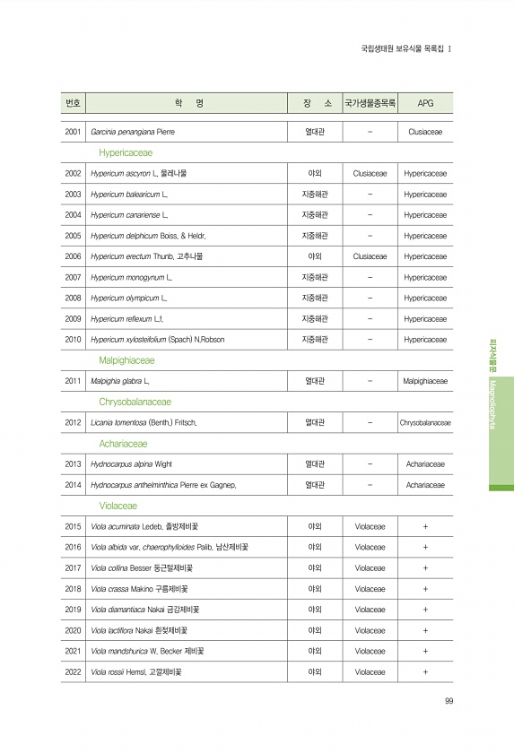 99 번호 학 명 장 소 국가생물종목록 APG 피자식물문 Magnoliophyta 국립생태원 보유식물 목록집 Ⅰ 2001 Garcinia penangiana Pierre 열대관 Clusiaceae Hypericaceae 2002 Hypericum ascyron L. 물레나물 야외 Clusiaceae Hypericaceae 2003 Hypericum balearicum L. 지중해관 Hypericaceae 2004 Hypericum canariense L. 지중해관 Hypericaceae 2005 Hypericum delphicum Boiss. & Heldr. 지중해관 Hypericaceae 2006 Hypericum erectum Thunb. 고추나물 야외 Clusiaceae Hypericaceae 2007...