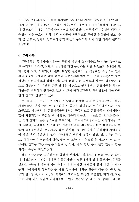80 온은 3월 초순까지 5℃이하를 유지하며 3월말부터 천천히 상승하여 6월말 20℃ 까지 상승하였다. eDNA 연구결과 서울, 익산, 나주에서 서식가능성이 나타났으 나 현장조사 시에는 나주에서만 서식을 확인하였다. 미국가재는 환경에 대한 적 응성이 매우 높으며, 정착 이후 개체군이 폭발적으로 증가할 위험성이 있고, 수 계 및 농수로, 농경지 등으로의 광역 확산도 우려되어 이에 대한 지속적 관리가 요구된다. 4. 큰금계국 큰금계국은 북아메리카 원산의 국화과 다년생 초본식물로 높이 3070cm정도 로 무리지어 자라고, 노란색 설상화를 가진 두상화는 지름 57cm로, 58월에 핀 다. 꽃이 크고, 개화기간이 길며, 다양한 환경에서 잘 적응하는 특성으로 인해 전국 곳곳에 식재되고 있다. 하지만 일본에서의 몇몇 연...