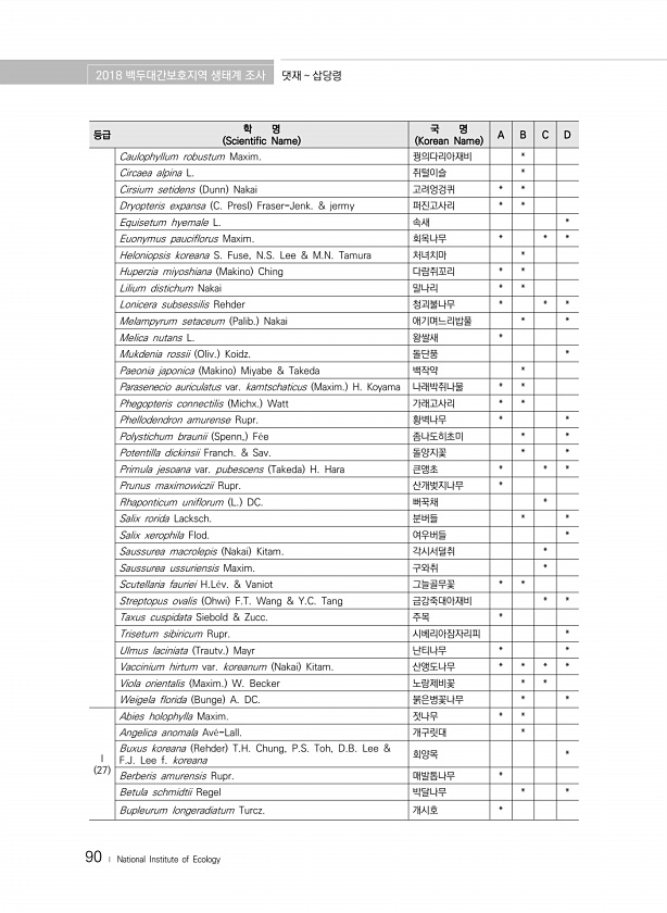 2018 백두대간보호지역 생태계 조사 댓재 삽당령 90 ? National Institute of Ecology 등급 학 명 Scientific Name 국 명 Korean Name A B C D Caulophyllum robustum Maxim. 꿩의다리아재비 * Circaea alpina L. 쥐털이슬 * Cirsium setidens Dunn Nakai 고려엉겅퀴 * * Dryopteris expansa C. Presl Fraser-Jenk. & jermy 퍼진고사리 * * Equisetum hyemale L. 속새 * Euonymus pauciflorus Maxim. 회목나무 * * * Heloniopsis koreana S. Fuse, N.S. Lee & M.N. Tamura 처녀치마 * Huper...