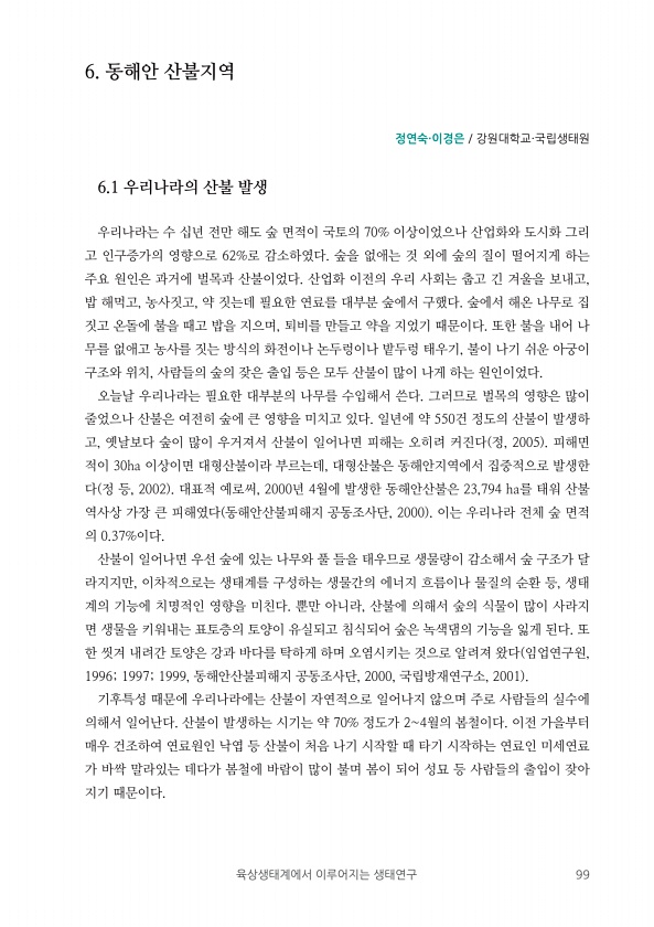 육상생태계에서 이루어지는 생태연구 99 6. 동해안 산불지역 정연숙·이경은 강원대학교·국립생태원 6.1 우리나라의 산불 발생 우리나라는 수 십년 전만 해도 숲 면적이 국토의 70% 이상이었으나 산업화와 도시화 그리 고 인구증가의 영향으로 62%로 감소하였다. 숲을 없애는 것 외에 숲의 질이 떨어지게 하는 주요 원인은 과거에 벌목과 산불이었다. 산업화 이전의 우리 사회는 춥고 긴 겨울을 보내고, 밥 해먹고, 농사짓고, 약 짓는데 필요한 연료를 대부분 숲에서 구했다. 숲에서 해온 나무로 집 짓고 온돌에 불을 때고 밥을 지으며, 퇴비를 만들고 약을 지었기 때문이다. 또한 불을 내어 나 무를 없애고 농사를 짓는 방식의 화전이나 논두렁이나 밭두렁 태우기, 불이 나기 쉬운 아궁이 구조와 위치, 사람들의 숲의 잦은 출입...