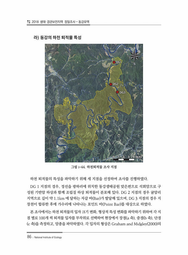 2018 생태·경관보전지역 정밀조사 동강유역 86 ? National Institute of Ecology 그림 i-44. 하천퇴적물 조사 지점 하천 퇴적물의 특성을 파악하기 위해 세 지점을 선정하여 조사를 진행하였다. DG 1 지점의 경우, 정선읍 광하리에 위치한 동강생태공원 맞은편으로 석회암으로 구 성된 기반암 하상과 함께 조립질 하상 퇴적물이 분포해 있다. DG 2 지점의 경우 귤암리 지역으로 길이 약 1.1km 에 달하는 자갈 바 Bar 가 발달해 있으며, DG 3 지점의 경우 지 장천이 합류한 후에 가수리에 나타나는 포인트 바 Point Bar 를 대상으로 하였다. 본 조사에서는 하천 퇴적물의 입자 크기 변화, 형상적 특성 변화를 파악하기 위하여 각 지 점 별로 100개 씩 퇴적물 입자를 무작위로 ...