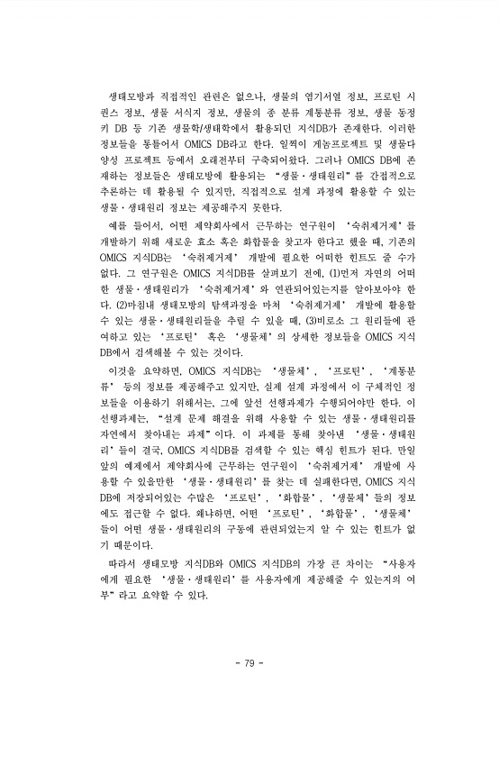 79 생태모방과 직접적인 관련은 없으나, 생물의 염기서열 정보, 프로틴 시 퀀스 정보, 생물 서식지 정보, 생물의 종 분류 계통분류 정보, 생물 동정 키 DB 등 기존 생물학/생태학에서 활용되던 지식DB가 존재한다. 이러한 정보들을 통틀어서 OMICS DB라고 한다. 일찍이 게놈프로젝트 및 생물다 양성 프로젝트 등에서 오래전부터 구축되어왔다. 그러나 OMICS DB에 존 재하는 정보들은 생태모방에 활용되는 “생물·생태원리”를 간접적으로 추론하는 데 활용될 수 있지만, 직접적으로 설계 과정에 활용할 수 있는 생물·생태원리 정보는 제공해주지 못한다. 예를 들어서, 어떤 제약회사에서 근무하는 연구원이 ‘숙취제거제’를 개발하기 위해 새로운 효소 혹은 화합물을 찾고자 한다고 했을 때, 기존의 OMICS 지식DB는 ‘...