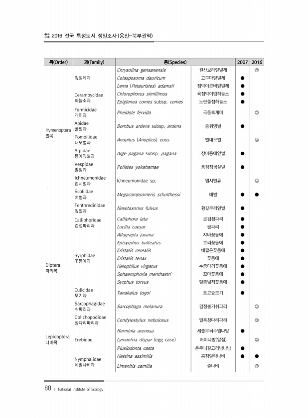 2016 전국 특정도서 정밀조사 옹진-북부권역 88 ? National Institute of Ecology 목 Order 과 Family 종 Species 2007 2016 잎벌레과 Chrysolina gensanensis 원산보라잎벌레 ◎ Colasposoma dauricum 고구마잎벌레 ● Lema Petauristes adamsii 점박이큰벼잎벌레 ● Cerambycidae 하늘소과 Chlorophorus simillimus 육점박이범하늘소 ● Epiglenea comes subsp. comes 노란줄점하늘소 ● Hymenoptera 벌목 Formicidae 개미과 Pheidole fervida 극동혹개미 ◎ Apidae 꿀벌과 Bombus ardens subsp. ardens 좀뒤영벌 ● Pompi...