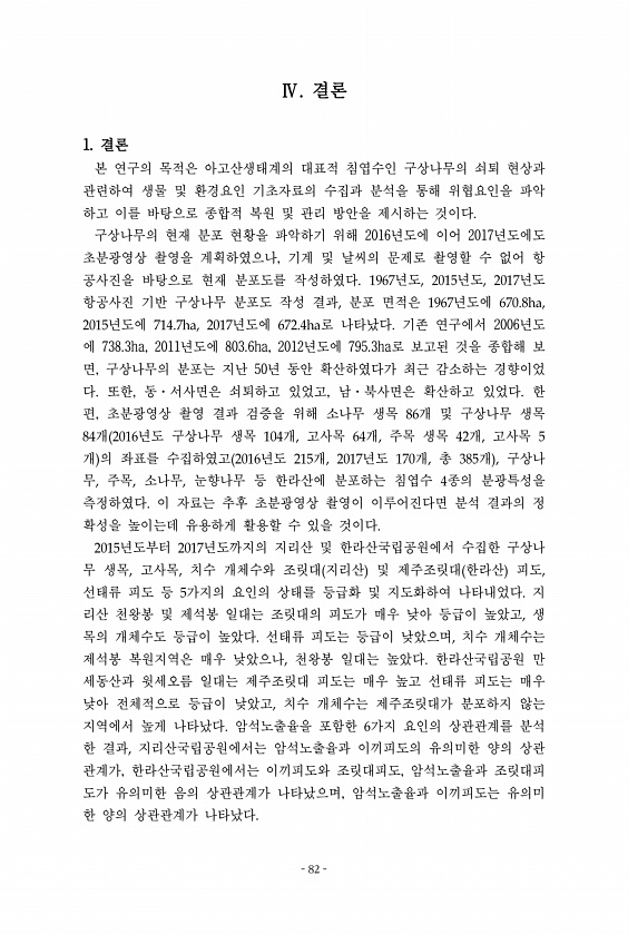 결론 1. 결론 본 연구의 목적은 아고산생태계의 대표적 침엽수인 구상나무의 쇠퇴 현상과 관련하여 생물 및 환경요인 기초자료의 수집과 분석을 통해 위협요인을 파악 하고 이를 바탕으로 종합적 복원 및 관리 방안을 제시하는 것이다. 구상나무의 현재 분포 현황을 파악하기 위해 2016년도에 이어 2017년도에도 초분광영상 촬영을 계획하였으나, 기계 및 날씨의 문제로 촬영할 수 없어 항 공사진을 바탕으로 현재 분포도를 작성하였다. 년도 년도 년도 항공사진 기반 구상나무 분포도 작성 결과 분포 면적은 년도에 년도에 년도에 로 나타났다. 기존 연구에서 2006년도 에 738.3ha, 2011년도에 803.6ha, 2012년도에 795.3ha로 보고된 것을 종합해 보 면, 구상나무의 분포는 지난 50년 동안 확산하였다가 ...