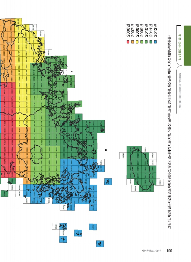 그림 15. 제3차 전국자연환경조사에서 2006-2012년의 조사지역 지도 지형, 식물상, 포유류, 조류, 양서·파충류, 육상곤충, 어류, 저서성 대형무척추동물 NATIONAL INSTITUTE OF ECOLOGY 자연환경조사 30년 100 제1장.전국자연환경조사