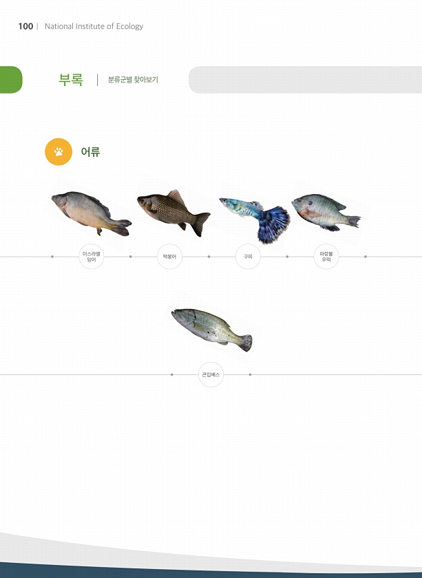 부록 분류군별 찾아보기 어류 이스라엘 잉어 큰입배스 떡붕어 구피 파랑볼 우럭 100 National Institute ofEcology