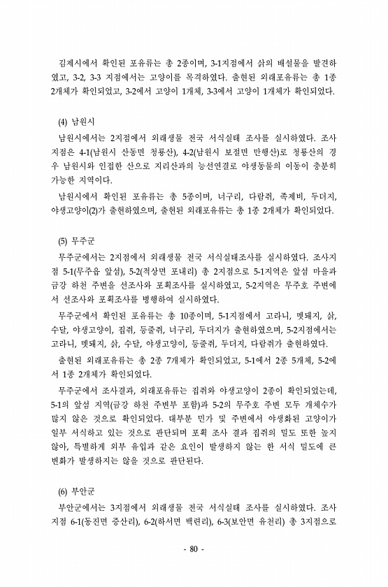 80 김제시에서 확인된 포유류는 총 2종이며, 3-1지점에서 삵의 배설물을 발견하 였고, 3-2, 3-3 지점에서는 고양이를 목격하였다. 출현된 외래포유류는 총 1종 2개체가 확인되었고, 3-2에서 고양이 1개체, 3-3에서 고양이 1개체가 확인되었다. 4 남원시 남원시에서는 2지점에서 외래생물 전국 서식실태 조사를 실시하였다. 조사 지점은 4-1 남원시 산동면 청룡산 , 4-2 남원시 보절면 만행산 로 청룡산의 경 우 남원시와 인접한 산으로 지리산과의 능선연결로 야생동물의 이동이 충분히 가능한 지역이다. 남원시에서 확인된 포유류는 총 5종이며, 너구리, 다람쥐, 족제비, 두더지, 야생고양이 2 가 출현하였으며, 출현된 외래포유류는 총 1종 2개체가 확인되었다. 5 무주군 무주군에서는 2지점에서 외래생물 전...