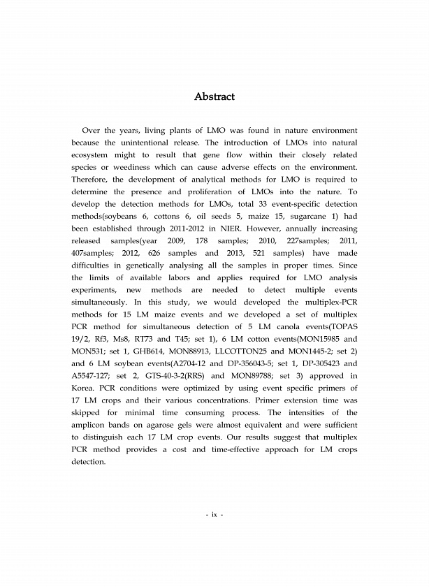 제목 : 유전자재조합생물체(LMO)의 동시 검출을 위한 multiplex-PCR법 개발(Ⅱ)