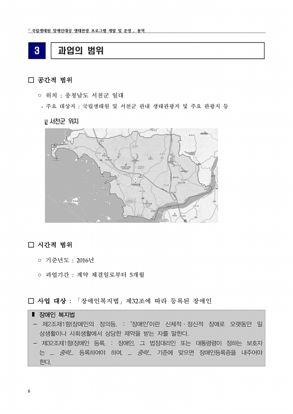 ?국립생태원 장애인대상 생태관광 프로그램 개발 및 운영? 용역 6 3 과업의 범위 □ 공간적 범위 ? 위치 충청남도 서천군 일대 주요 대상지 국립생태원 및 서천군 관내 생태관광지 및 주요 관광지 등 □ 시간적 범위 ? 기준년도 2016년 ? 과업기간 계약 체결일로부터 5개월 □ 사업 대상 「장애인복지법」제32조에 따라 등록된 장애인 ? 장애인 복지법 제2조제1항 장애인의 정의등. 장애인이란 신체적·정신적 장애로 오랫동안 일 상생활이나 사회생활에서 상당한 제약을 받는 자를 말한다. 제32조제1항 장애인 등록. 장애인, 그 법정대리인 또는 대통령령이 정하는 보호자 는 ... 중략... 등록하여야 하며, ... 중략... 기준에 맞으면 장애인등록증을 내주어야 한다. 서천군위치