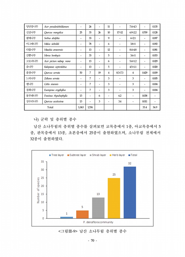 70 당단풍나무 Acer pseudosieboldianum 26 11 7.4±4.3 0.135 신갈나무 Quercus mongolica 25 33 26 10 17±12 6.9±2.2 0.709 0.128 팥배나무 Sorbus alnifolia 33 9 6±2.1 0.097 아그배나무 Malus sieboldii 78 6 3.8±1 0.092 다릅나무 Maackia amurensis 13 12 8.4±4.8 0.081 산뽕나무 Morus bombycis 33 5 3.6±1 0.033 고로쇠나무 Acer pictum subsp. mono 13 6 5.4±1.2 0.029 음나무 Kalopanax septemlobus 13 5 4.5±1.1 0.020 졸참나무 Quercus serrata 50 7 19 4 8.3...