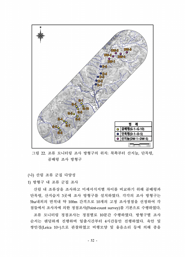 52 그림 22. 조류 모니터링 조사 방형구의 위치북쪽부터 산지늪, 단목령, 곰배령 조사 방형구 나 산림 조류 군집 다양성 1 방형구 내 조류 군집 조사 산림 내 조류상을 조사하고 미세서식지별 차이를 비교하기 위해 곰배령과 단목령, 산지습지 3곳에 조사 방형구를 설치하였다. 각각의 조사 방형구는 5ha내외의 면적내 약 100m 간격으로 10개의 고정 조사정점을 선정하여 각 점들에서 조사자에 의한 정점조사 Point-count survey 를 기본으로 수행하였다. 조류 모니터링 정점조사는 정점별로 10분간 수행하였다. 방형구별 조사 순서는 랜덤하게 진행하며 일출시간부터 4시간동안 진행하였다. 육안 및 쌍안경 Leica 10× 으로 관찰하였고 비행모양 및 울음소리 등에 의해종을
