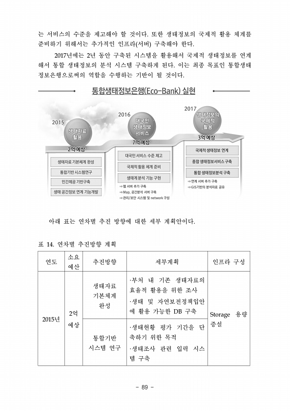 연도 소요 예산 추진방향 세부계획 인프라 구성 2015년 2억 예상 생태자료 기본체계 완성 ·부처 내 기존 생태자료의 효율적 활용을 위한 조사 ·생태 및 자연보전정책입안 에 활용 가능한 DB 구축 Storage 용량 증설 통합기반 시스템 연구 ·생태현황 평가 기간을 단 축하기 위한 목적 ·생태조사 관련 입력 시스 템 구축 는 서비스의 수준을 제고해야 할 것이다. 또한 생태정보의 국제적 활용 체계를 준비하기 위해서는 추가적인 인프라 서버 구축해야 한다. 2017년에는 2년 동안 구축된 시스템을 활용해서 국제적 생태정보를 연계 해서 통합 생태정보의 분석 시스템 구축하게 된다. 이는 최종 목표인 통합생태 정보은행으로써의 역할을 수행하는 기반이 될 것이다. 아래 표는 연차별 추진 방향에 대한 세부 계획안이다. 표 ...