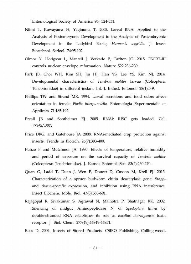 Entomological Society of America 96, 524-531. Niimi T, Kuwayama H, Yaginuma T. 2005. Larval RNAi Applied to the Analysis of Postembryonic Development to the Analysis of Postembryonic Development in the Ladybird Beetle, Harmonia axyridis. J. Insect Biotechnol. Seriool. 7495-102. Olmos Y, Hodgson L, Mantell J, Verkade P, Carlton JG. 2015. ESCRT-III controls nuclear envelope reformation. Nature 52223...