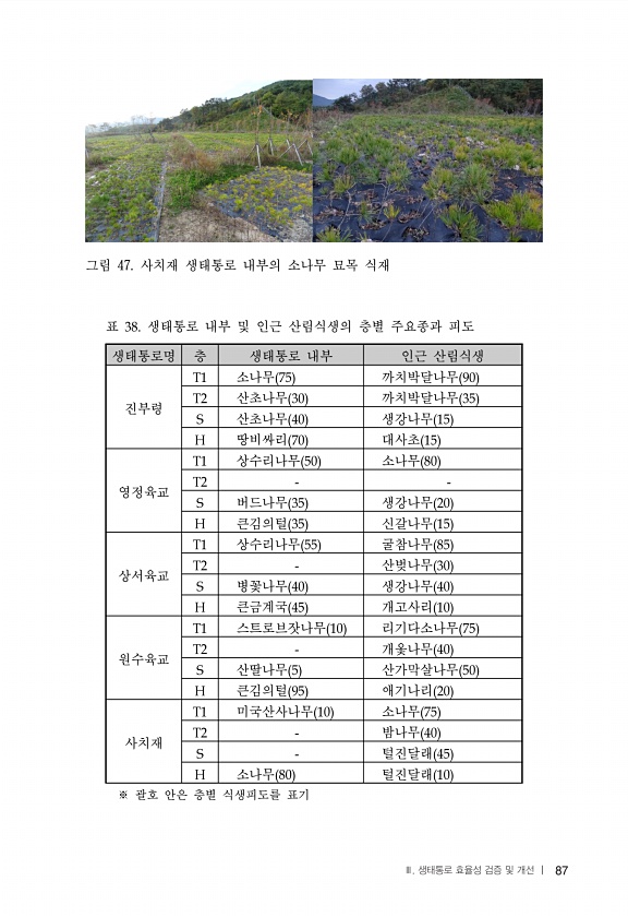 87 그림 47. 사치재 생태통로 내부의 소나무 묘목 식재 생태통로명 층 생태통로 내부 인근 산림식생 진부령 소나무 까치박달나무 산초나무 까치박달나무 산초나무 생강나무 땅비싸리 대사초 영정육교 상수리나무 소나무 버드나무 생강나무 큰김의털 신갈나무 상서육교 상수리나무 굴참나무 산벚나무 병꽃나무 생강나무 큰금계국 개고사리 원수육교 스트로브잣나무 리기다소나무 개옻나무 산딸나무 산가막살나무 큰김의털 애기나리 사치재 미국산사나무 소나무 밤나무 털진달래 소나무 털진달래 괄호 안은 층별 식생피도를 표기 표 생태통로 내부 및 인근 산림식생의 층별 주요종과 피도 Ⅲ. 생태통로 효율성 검증 및 개선 |87