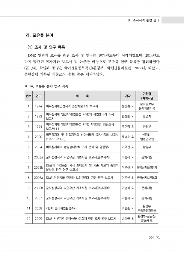 Ⅱ. 조사지역 종합 결과 75 번호 연도 제 목 저자 기관명 /학회지명 1 1974 비무장지대인접지역 종합학술조사 보고서 원병휘 외 문화공보부 문화재관리국 2 1992 비무장지대 인접지역 민통선 지역 의 자연생태계 조사 보고서 한상훈 외 환경처 3 1995 비무장지대 인접지역 민통선 지역 자연환경 정밀조사 보고서 Ⅰ 우한정 외 환경부 4 2000 비무장지대 및 인접지역의 산림생태계 조사 종합 보고서 1995∼2000 유병호 외 임업연구원 산림청· 5 2004 비무장지대의 환경생태학적 조사·분석 및 영향평가 이우신 외 환경부 6 2005a 군사접경지역 자연유산 기초자원 보고서 중부지역 이흥식 외 문화재청 7 2005b DMZ의 야생동물 서식 실태조사 및 기존 자료의 종합적 분석에 관한 연구 보고서 이우신 외 ...