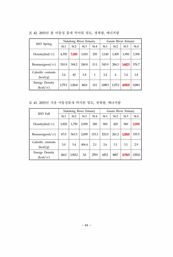 84 표 42. 2015년 봄 이동성 물새 먹이원 밀도, 생체량, 에너지량 2015 Spring Nakdong River Estuary Geum River Estuary St.1 St.2 St.3 St.4 St.1 St.2 St.3 St.4 Density Ind/㎡ 4,350 7,450 3,010 250 3,140 1,400 1,950 3,300 Biomass gwet/㎡ 510.9 304.2 240.8 13.1 543.9 284.3 1,442.3 576.7 Calorific contents kcal/g 3.4 40 1.8 1 3.4 4 3.4 1.8 Energy Density kcal/㎡ 1,737.1 1,216.8 443.4 13.1 1,849.3 1,137.2 4,903.8 1,038.1 표 43. 2...
