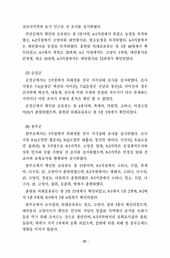 81 전조사지역의 농가 인근을 선 조사를 실시하였다. 부안군에서 확인된 포유류는 총 3종이며, 6-1지점에서 흑염소 농장을 목격하 였고, 6-2지점에서 고양이와 대만꽃사슴, 염소농장을 목격하였다. 6-3지점에서 는 대만꽃사슴 농장을 목격하였다. 출현된 외래포유류는 총 3종 60개체가 확 인되었고, 6-1에서 흑염소 20개체, 6-2 지점에서는 고양이 1개체, 대만꽃사슴 17개체, 염소 10개체, 6-3지점에서는 대만꽃사슴 12개체가 확인되었다. 7 순창군 순창군에서는 2지점에서 외래생물 전국 서식실태 조사를 실시하였다. 조사 지점은 7-1 순창군 백산리 아미산 , 7-2 순창군 신남리 동산 로 아미산의 경우 산자락에 백산지, 내동제, 산수제 주변 수계와 연결된 저수지가 다수 존재하는 지역이나 이번 조사시 수...