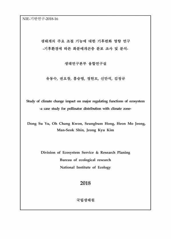 NIE-? -2018-16 ? ? ? , , , , , ? ? Study of climate change impact on major regulating functions of ecosystem -a case study for pollinator distribution with climate zoneDong Su Yu, Oh Chang Kwon, Seungbum Hong, Heon Mo Jeong, Man-Seok Shin, Jeong Kyu Kim Division of Ecosystem Service & Research Planing Bureau of ecological research National Institute of Ecology 2018