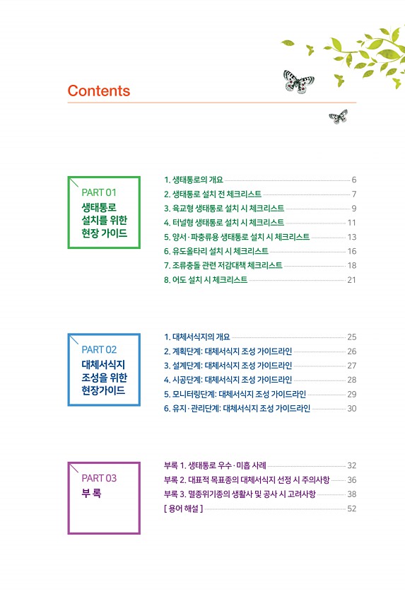 1. 생태통로의 개요 6 2. 생태통로 설치 전 체크리스트 7 3. 육교형 생태통로 설치 시 체크리스트 9 4. 터널형 생태통로 설치 시 체크리스트 11 5. 양서·파충류용 생태통로 설치 시 체크리스트 13 6. 유도올타리 설치 시 체크리스트 16 7. 조류충돌 관련 저감대책 체크리스트 18 8. 어도 설치 시 체크리스트 21 1. 대체서식지의 개요 25 2. 계획단계대체서식지 조성 가이드라인 26 3. 설계단계대체서식지 조성 가이드라인 27 4. 시공단계대체서식지 조성 가이드라인 28 5. 모니터링단계대체서식지 조성 가이드라인 29 6. 유지·관리단계대체서식지 조성 가이드라인 30 부록 1. 생태통로 우수·미흡 사례 32 부록 2. 대표적 목표종의 대체서식지 선정 시 주의사항 36 부록 3. 멸종위기종의 ...