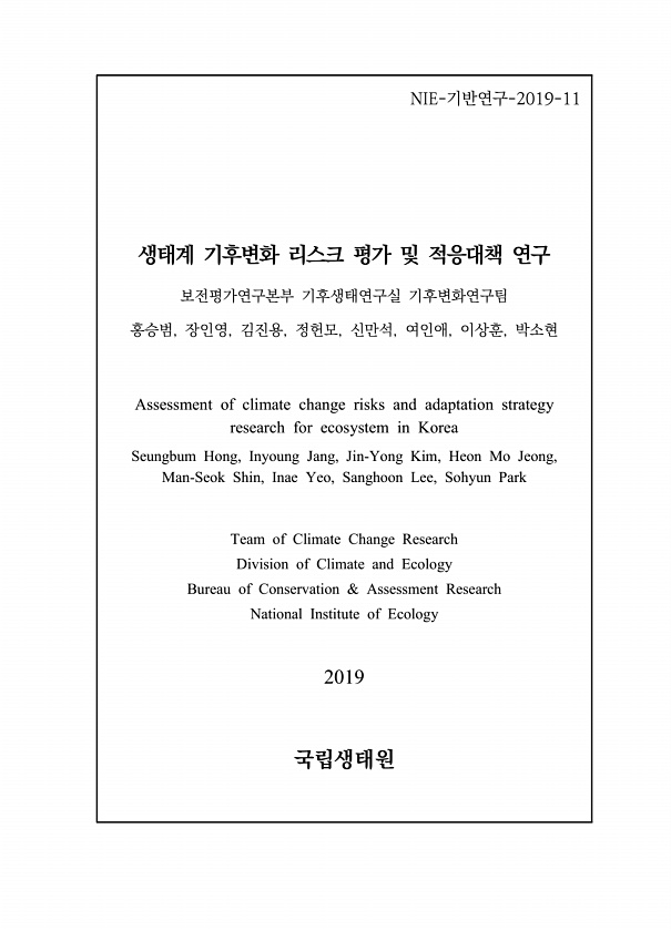 NIE-기반연구-2019-11 생태계 기후변화 리스크 평가 및 적응대책 연구 보전평가연구본부 기후생태연구실 기후변화연구팀 홍승범, 장인영, 김진용, 정헌모, 신만석, 여인애, 이상훈, 박소현 Assessment of climate change risks and adaptation strategy research for ecosystem in Korea Seungbum Hong, Inyoung Jang, Jin-Yong Kim, Heon Mo Jeong, Man-Seok Shin, Inae Yeo, Sanghoon Lee, Sohyun Park Team of Climate Change Research Division of Climate and Ecology Bureau of Conservation & Asse...