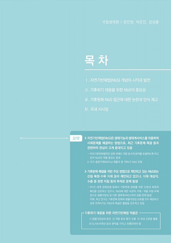 01 기후위기 대응을 위한 자연기반해법 NbS 의 국제논의 동향과 시사점 국립생태원 | 장인영, 박은진, 강성룡 목 차 Ⅰ. 자연기반해법 NbS 개념의 시작과 발전 Ⅱ. 기후위기 대응을 위한 NbS의 중요성 Ⅲ. 기후완화 NbS 접근에 대한 논란과 인식 제고 Ⅳ. 국내 시사점 요약 자연기반해법 NbS 은 생태기능과 생태계서비스를 이용하여 사회문제를 해결하는 방법으로, 최근 기후문제 해결 등과 관련하여 관심이 크게 증대되고 있음 파리기후변화협약은 감축 외에도 적응 등 6개 분야를 포괄하도록 하고 있어 NbS의 역할 중요도 증대 ※ 국가 결정기여 NDCs 제출국 중 78%가 NbS 포함 기후문제 해결을 위한 주요 방법으로 제안되고 있는 NbS로는 산림 복원·수목 식재 등이 제안되고 있으나, 식재 대상지, 수종 ...