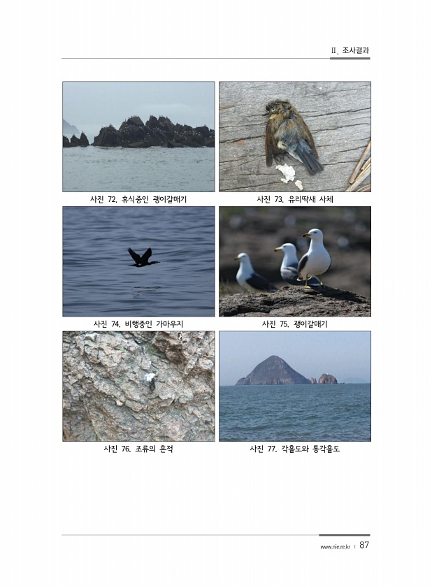 Ⅱ. 조사결과 www.nie.re.kr ? 87 사진 72. 휴식중인 괭이갈매기 사진 73. 유리딱새 사체 사진 74. 비행중인 가마우지 사진 75. 괭이갈매기 사진 76. 조류의 흔적 사진 77. 각흘도와통각흘도