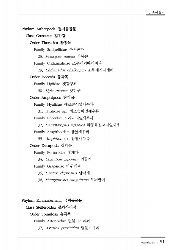 Ⅱ. 조사결과 www.nie.re.kr ? 91 Phylum Arthropoda 절지동물문 Class Crustacea 갑각강 Order Thoracica 완흉목 Family Scalpellidae 부처손과 28. Pollicipes mitella 거북손 Family Chthamalidae 조무래기따개비과 29. Chthamalus challengeri 조무래기따개비 Order Isopoda 등각목 Family Ligiidae 갯강구과 30. Ligia exotica 갯강구 Order Amphipoda 단각목 Family Hyalidae 해조숨이옆새우과 31. Hyalidae sp. 해조숨이옆새우류 Family Photidae 꼬리다리옆새우과 32. Gammaropsis japonica 극동육질꼬리옆새우 F...
