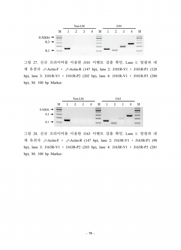 79 27. J101 Lane 1-Actin-F + -Actin-R 147 bp , lane 2J101R-V1 + J101R-P1 120 bp , lane 3J101R-V1 + J101R-P2 202 bp , lane 4J101R-V1 + J101R-P3 280 bp , M100 bp Marker. 28. J163 Lane 1-Actin-F + -Actin-R 147 bp , lane 2J163R-V1 + J163R-P1 98 bp , lane 3J163R-V1 + J163R-P2 203 bp , lane 4J163R-V1 + J163R-P3 281 bp , M100 bpMarker.