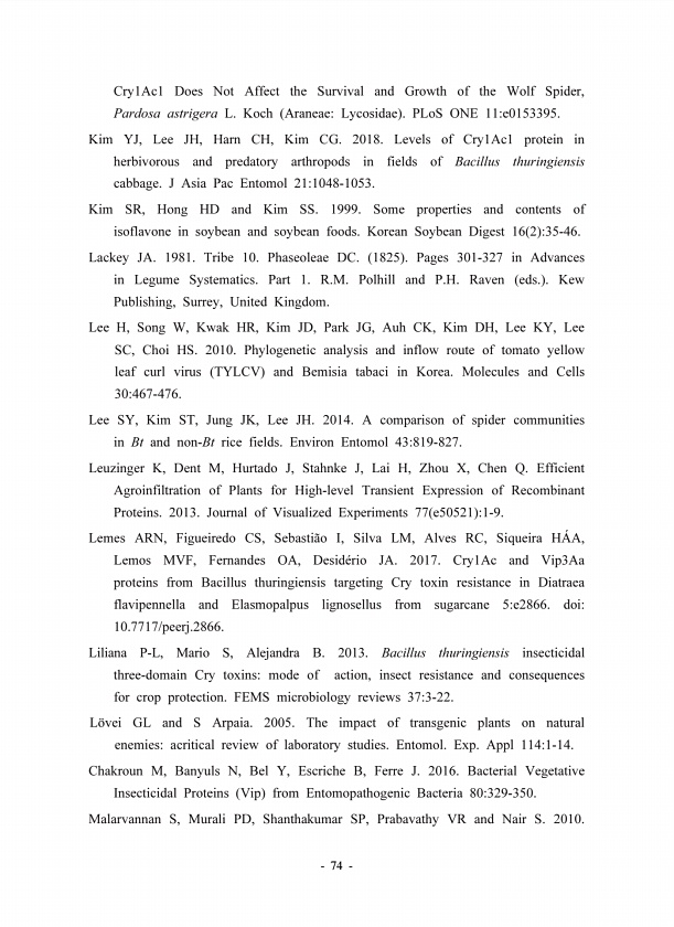 74 Cry1Ac1 Does Not Affect the Survival and Growth of the Wolf Spider, Pardosa astrigera L. Koch AraneaeLycosidae PLoS ONE 11e0153395. Kim YJ, Lee JH, Harn CH, Kim CG. 2018. Levels of Cry1Ac1 protein in herbivorous and predatory arthropods in fields of Bacillus thuringiensis cabbage. J Asia Pac Entomol 211048-1053. Kim SR, Hong HD and Kim SS. 1999. Some properties and contents of isoflavone in soy...