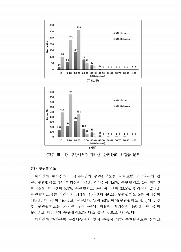 73 구상나무 전체 그림 Ⅲ-11 구상나무림 지리산, 한라산 의 직경급 분포 다 수관활력도 지리산과 한라산의 구상나무림의 수관활력도를 살펴보면 구상나무의 경 우, 수관활력도 1이 지리산이 0.3%, 한라산이 1.6%, 수관활력도 2는 지리산 이 6.8%, 한라산이 8.1%, 수관활력도 3은 지리산이 23.5%, 한라산이 24.7%, 수관활력도 4는 지리산이 51.1%, 한라산이 49.2%, 수관활력도 5는 지리산이 18.3%, 한라산이 16.3%로 나타났다. 엽량 60% 이상 수관활력도 4, 5 의 건전 한 수관활력도를 가지는 구상나무의 비율이 지리산이 69.3%, 한라산이 65.5%로 지리산의 수관활력도가 다소 높은 것으로 나타났다. 지리산과 한라산의 구상나무림의 전체 수종에 대한 수관활력도를살펴보