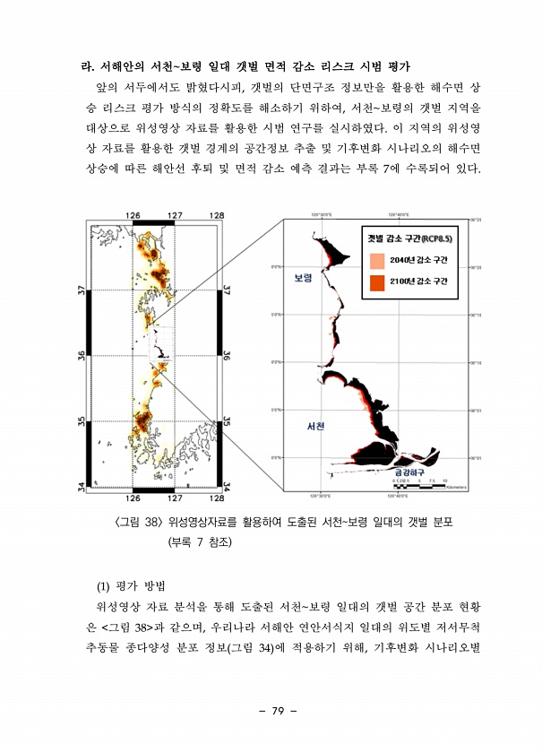 79 라. 서해안의 서천보령 일대 갯벌 면적 감소 리스크 시범 평가 앞의 서두에서도 밝혔다시피, 갯벌의 단면구조 정보만을 활용한 해수면 상 승 리스크 평가 방식의 정확도를 해소하기 위하여, 서천보령의 갯벌 지역을 대상으로 위성영상 자료를 활용한 시범 연구를 실시하였다. 이 지역의 위성영 상 자료를 활용한 갯벌 경계의 공간정보 추출 및 기후변화 시나리오의 해수면 상승에 따른 해안선 후퇴 및 면적 감소 예측 결과는 부록 7에 수록되어 있다. 그림 38 위성영상자료를 활용하여 도출된 서천보령 일대의 갯벌 분포 부록 7 참조 1 평가 방법 위성영상 자료 분석을 통해 도출된 서천보령 일대의 갯벌 공간 분포 현황 은 그림 38 과 같으며, 우리나라 서해안 연안서식지 일대의 위도별 저서무척 추동물 종다양성 분포 정보 그...