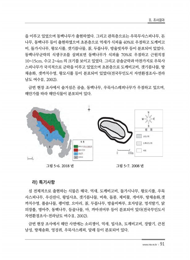 II. 조사결과 www.nie.re.kr ? 91 을 이루고 있었으며 동백나무가 출현하였다. 그리고 관목층으로는 우묵무사스피나무, 돈 나무, 동백나무 등이 출현하였으며 초본층으로 억새가 식피율 40%로 우점하고 도깨비고 비, 돌가시나무, 왕모시풀, 갯기름나물, 칡, 두릅나무, 방울빗자루 등이 분포되어 있었다. 동백나무군락의 식생구조를 살펴보면 동백나무가 식피율 70%로 우점하고 근원직경 1015cm, 수고 24m 의 크기를 보이고 있었다. 그리고 곰솔군락과 마찬가지로 우묵사 스피나무가 국지적으로 군락을 이루고 있었으며 초본층으로 도깨비고비, 갯기름나물, 땅 채송화, 갯까치수영, 왕모시풀 등이 분포되어 있었다 전국무인도서 자연환경조사-전라 남도 여수Ⅱ, 2002 금번 현장 조사에서 솔거섬은 곰솔, 동백나무, ...