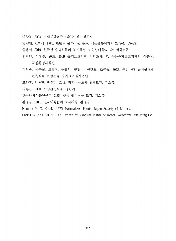 89 이창복. 2003. 원색대한식물도감 상, 하 향문사. 임양재, 전의식. 1980. 한반도 귀화식물 분포. 식물분류학회지 23 3-4 69-83. 임용석. 2010. 한국산 수생식물의 분포특성. 순천향대학교 박사학위논문. 전정일, 이홍수. 2009. 2009 습지보호지역 정밀조사V. 두웅습지보호지역의 식물상. 국립환경과학원. 정영숙, 이우철, 조강현, 주광영, 민병미, 현진오, 조규송. 2012. 우리나라 습지생태계 관속식물 유형분류. 수생태복원사업단. 조양훈, 김종환, 박수현. 2016. 벼과·사초과 생태도감. 지오북. 최홍근. 2000. 수생관속식물. 정행사. 한국양치식물연구회. 2005. 한국 양치식물 도감. 지오북. 환경부. 2011. 전국내륙습지 조사지침. 환경부. Numata M, O. Kot...