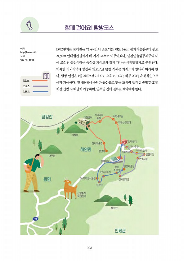 098 함께 걸어요! 탐방코스 DMZ펀치볼 둘레길은 약 4시간이 소요되는 편도 14km 평화의숲길부터 편도 21.9km 만대벌판길까지 네 가지 코스로 이루어졌다. 민간인출입통제구역 내 에 조성된 숲길이라는 특성상 가이드와 함께 다니는 예약탐방제로 운영된다. 미확인 지뢰지역과 연접해 있으므로 탐방 시에는 가이드의 안내에 따라야 한 다. 탐방 인원은 1일 2회 오전 9시 30분, 오후 1시 30분 , 하루 200명만 선착순으로 예약 가능하다. 펀치볼에서 수확한 농산물로 만든 도시락 ‘둘레길 숲밥’은 20명 이상 신청 시 배달이 가능하며, 일주일 전에 전화로 예약해야 한다. 1코스 2코스 3코스 예약 http//komount.kr 문의 033 4818565