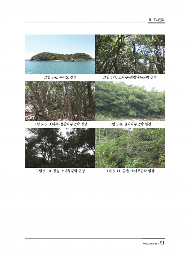 II. 조사결과 www.nie.re.kr ? 91 그림 5-6. 무인도 전경 그림 5-7. 소나무-졸참나무군락 근경 그림 5-8. 소나무-졸참나무군락 임상 그림 5-9. 굴피나무군락 원경 그림 5-10. 곰솔-소나무군락 근경 그림 5-11. 곰솔-소나무군락임상