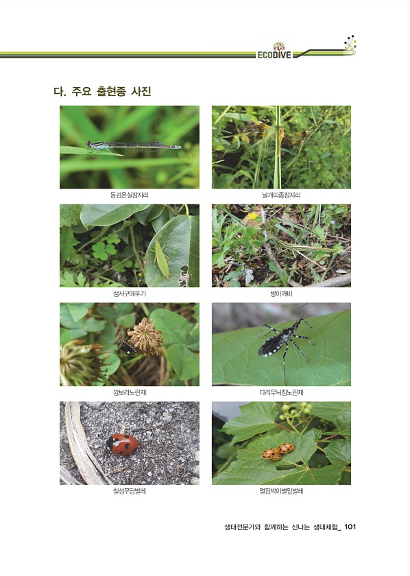 생태전문가와 함께하는 신나는 생태체험_ 101 다. 주요 출현종 사진 등검은실잠자리 날개띠좀잠자리 섬서구메뚜기 방아깨비 깜보라노린재 다리무늬침노린재 칠성무당벌레열점박이별잎벌레