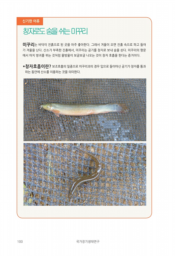 100 국가장기생태연구 신기한 어류 미꾸리는 바닥이 진흙으로 된 곳을 아주 좋아한다. 그래서 겨울이 오면 진흙 속으로 파고 들어 가 겨울을 난다. 산소가 부족한 진흙에서, 미꾸리는 공기를 창자로 보내 숨을 쉰다. 미꾸리의 항문 에서 마치 방귀를 뀌는 것처럼 물방울이 보글보글 나오는 것이 창자 호흡을 한다는 증거이다. *창자호흡이란? 보조호흡의 일종으로 미꾸리과의 경우 입으로 들이마신 공기가 창자를 통과 하는 동안에 산소를 이용하는 것을 의미한다. 창자로도 숨을 쉬는미꾸리
