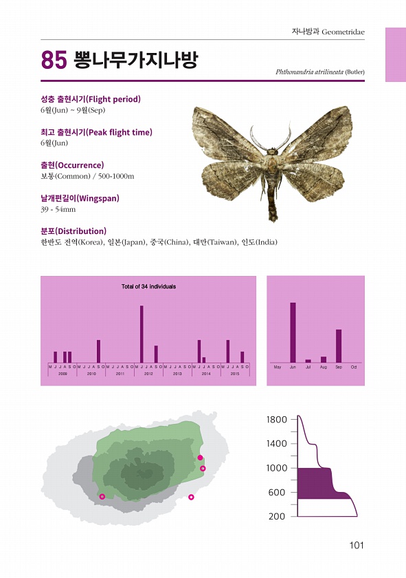 101 자나방과 Geometridae 성충 출현시기 Flight period 6월 Jun 9월 Sep 최고 출현시기 Peak fight time 6월 Jun 출현 Occurrence 보통 Common 500-1000m 날개편길이 Wingspan 39 54mm 분포 Distribution 한반도 전역 Korea , 일본 Japan , 중국 China , 대만 Taiwan , 인도 India Phthonandria atrilineata Butler M J J A S O M J J A S O M J J A S O M J J A S O M J J A S O M J J A S O M J J A S O May Jun Jul Aug Sep Oct 2009 2010 2011 2012 2013 2014 2015 Total ...