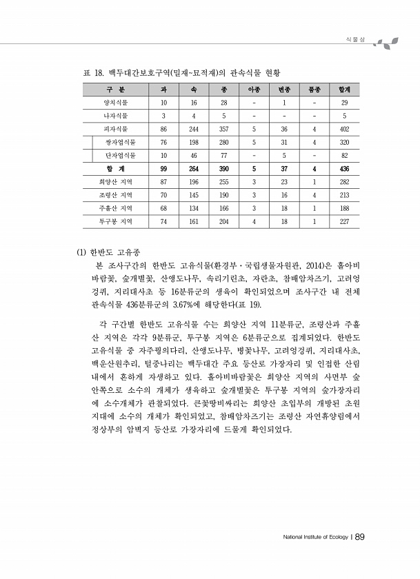 식 물 상 National Institute of EcologyⅠ89 구 분 과 속 종 아종 변종 품종 합계 양치식물 10 16 28 1 29 나자식물 3 4 5 5 피자식물 86 244 357 5 36 4 402 쌍자엽식물 76 198 280 5 31 4 320 단자엽식물 10 46 77 5 82 합 계 99 264 390 5 37 4 436 희양산 지역 87 196 255 3 23 1 282 조령산 지역 70 145 190 3 16 4 213 주흘산 지역 68 134 166 3 18 1 188 투구봉 지역 74 161 204 4 18 1 227 표 18. 백두대간보호구역 밀재묘적재 의 관속식물 현황 1 한반도 고유종 본 조사구간의 한반도 고유식물 환경부·국립생물자원관, 2014 은 홀아비 바람꽃, 숲개별...