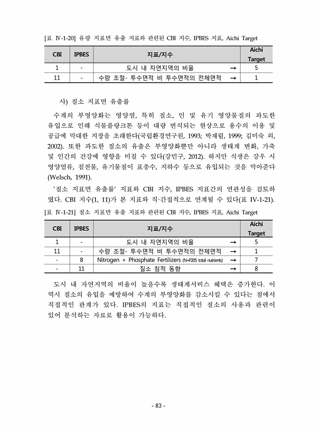 CBI IPBES 지표/지수 Aichi Target 1 도시 내 자연지역의 비율 → 5 11 수량 조절- 투수면적 비 투수면적의 전체면적 → 1 [표 Ⅳ-1-20] 유량 지표면 유출 지표와 관련된 CBI 지수, IPBES 지표, Aichi Target 사 질소 지표면 유출률 수계의 부영양화는 영양염, 특히 질소, 인 및 유기 영양물질의 과도한 유입으로 인해 식물플랑크톤 등이 대량 번식되는 현상으로 용수의 이용 및 공급에 막대한 지장을 초래한다 국립환경연구원, 1993; 박재림, 1999; 김미숙 외, 2002 또한 과도한 질소의 유출은 부영양화뿐만 아니라 생태계 변화, 가축 및 인간의 건강에 영향을 미칠 수 있다 강민구, 2012 하지만 식생은 강우 시 영양염류, 침전물, 유기물질이 표층수, 지하수 등으로 ...