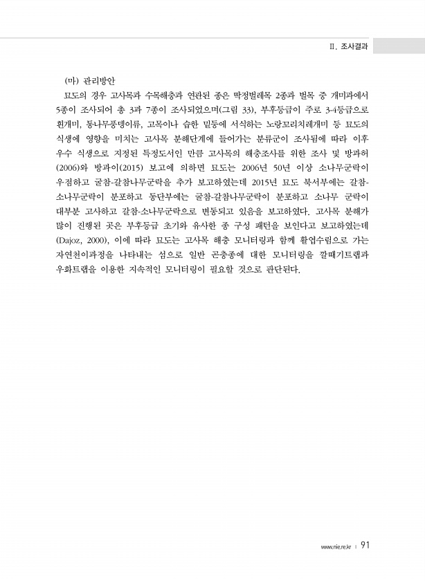 Ⅱ. 조사결과 www.nie.re.kr ? 91 마 관리방안 묘도의 경우 고사목과 수목해충과 연관된 종은 딱정벌레목 2종과 벌목 중 개미과에서 5종이 조사되어 총 3과 7종이 조사되었으며 그림 33 , 부후등급이 주로 3-4등급으로 흰개미, 통나무풍뎅이류, 고목이나 습한 밑둥에 서식하는 노랑꼬리치레개미 등 묘도의 식생에 영향을 미치는 고사목 분해단계에 들어가는 분류군이 조사됨에 따라 이후 우수 식생으로 지정된 특정도서인 만큼 고사목의 해충조사를 위한 조사 및 방과허 2006 와 방과이 2015 보고에 의하면 묘도는 2006년 50년 이상 소나무군락이 우점하고 굴참-갈참나무군락을 추가 보고하였는데 2015년 묘도 북서부에는 갈참- 소나무군락이 분포하고 동단부에는 굴참-갈참나무군락이 분포하고 소나무 군락이 대부...